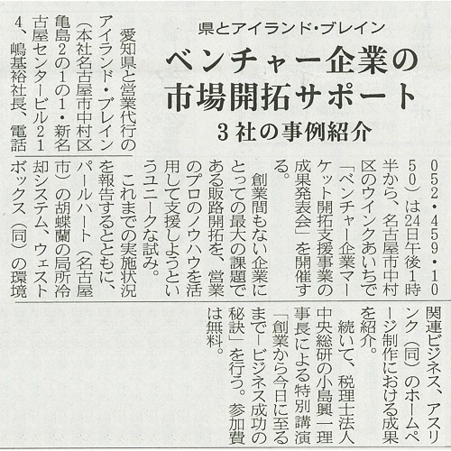 中部経済新聞 ベンチャー企業マーケット開拓支援事業の成果発表会開催についての記事掲載_2011/03/01 | 営業代行・営業コンサルタント会社は株式会社アイランドブレイン【東京・大阪・名古屋】| 55業種・1,800社以上の確かな導入実績!