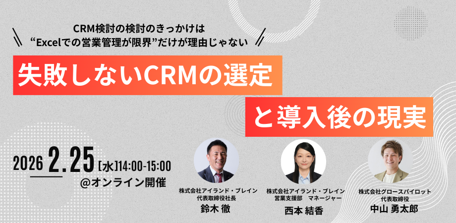 参加募集中 2026.02.25(水) 14時~15時 失敗しないCRMの選定と導入後の現実 CRMを導入したのに、現場が入力しない。結局Excelが残り、数字は見えるようにならず、会議は変わらない——。 率直に言うと、CRM導入の失敗原因は「ツールが悪い」よりも… このウェビナーに参加する
